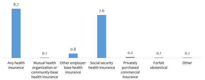 Results: The coverage of health insurance among women was 8.7%. The majority of the women subscribed to social security health insurance (7.6%). Women aged 35 years and above [aOR = 1.54; 95% CI = 1.24, 1.92] were more likely to be covered by health insurance relative to those aged 15-24. The likelihood of being covered by health insurance increased with increasing level of education with the highest odds among women with higher education [aOR = 6.09; 95% CI = 3.93, 9.42]. Women in the richest wealth index households [aOR = 22.12; 95% CI = 9.52, 51.41] and those with grand parity [aOR = 2.16; 95% CI = 1.62, 2.87] had the highest odds of being covered by health insurance. Women who were working, those who watched television, and those who used the internet were more likely to be covered by health insurance relative to their counterparts who were not working, those who did not watch television, and those who did not use the internet. Women residing in Tiris zemour et Inchiri [aOR = 3.60; 95%CI = 1.60, 8.10], Tagant (aOR = 3.74; 95% CI = 1.61, 8.68], and Adrar [aOR = 2.76; 95% CI = 1.36, 5.61] regions were more likely to be covered by health insurance compared with those from Hodh Echargui.