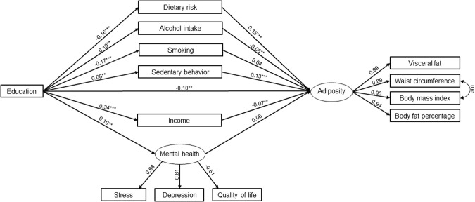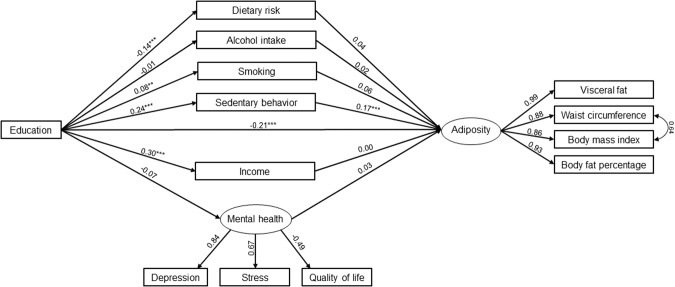 Results: The negative direct effect of education on adiposity was statistically significant at 5% level of significance in both sexes. For men, the indirect effect was statistically significant via sedentary behavior (β = 0.041; 95% CI [0.025-0.062]) with a mediation ratio of 23.7%. In women, the indirect effect was statistically significant via dietary risk (β = -0.023, 95% CI [-0.037, -0.013]), alcohol intake (β = -0.006; 95% CI [-0.014, -0.001]), sedentary behavior (β = 0.012, 95% CI [0.004,0.023]), income (β = -0.022; 95% CI [-0.041, -0.004]), and mental health (β = -0.007; 95% CI [-0.019, -0.001]). The total mediation ratio in women was 30.5%.