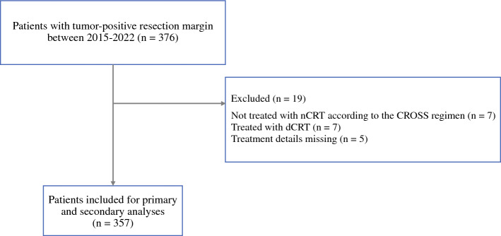 Background: Approximately 4-9% of patients have a tumor-positive resection margin after neoadjuvant chemoradiotherapy (nCRT) and esophagectomy. Although it is associated with decreased survival, Western guidelines do not recommend adjuvant treatment.