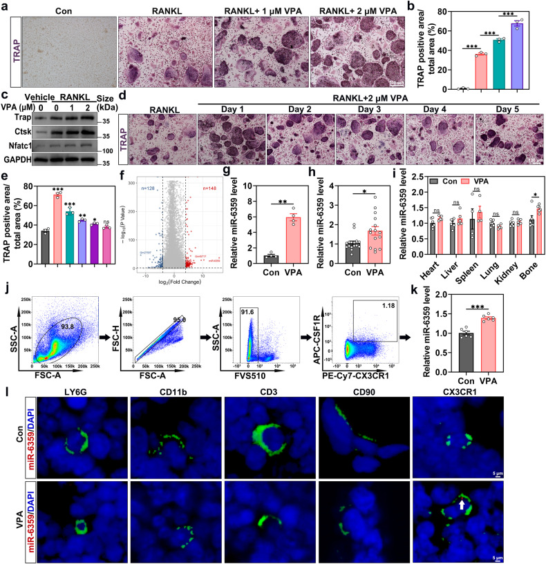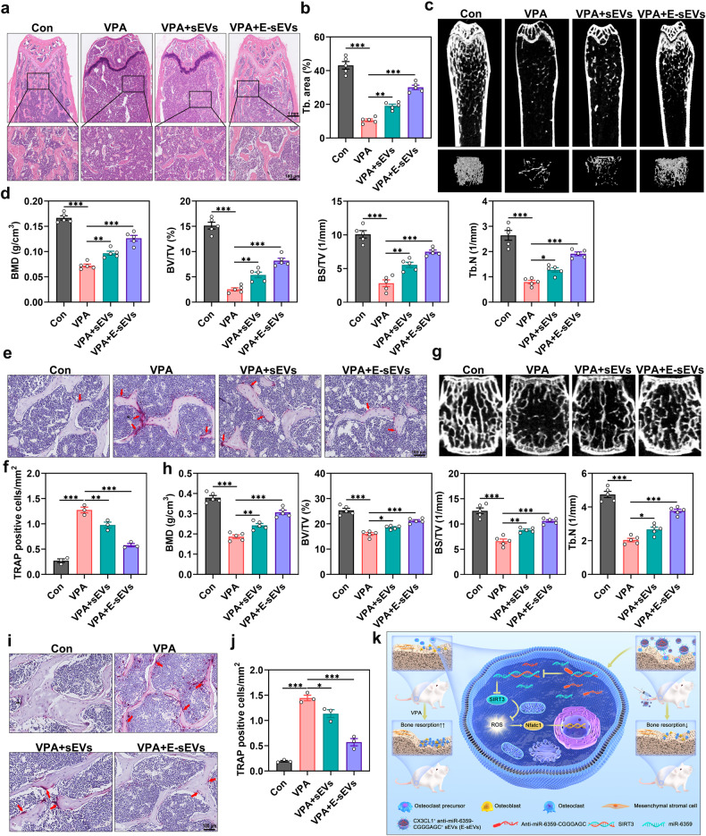 The clinical role and underlying mechanisms of valproic acid (VPA) on bone homeostasis remain controversial. Herein, we confirmed that VPA treatment was associated with decreased bone mass and bone mineral density (BMD) in both patients and mice. This effect was attributed to VPA-induced elevation in osteoclast formation and activity. Through RNA-sequencing, we observed a significant rise in precursor miR-6359 expression in VPA-treated osteoclast precursors in vitro, and further, a marked upregulation of mature miR-6359 (miR-6359) in vivo was demonstrated using quantitative real-time PCR (qRT-PCR) and miR-6359 fluorescent in situ hybridization (miR-6359-FISH). Specifically, the miR-6359 was predominantly increased in osteoclast precursors and macrophages but not in neutrophils, T lymphocytes, monocytes and bone marrow-derived mesenchymal stem cells (BMSCs) following VPA stimulation, which influenced osteoclast differentiation and bone-resorptive activity. Additionally, VPA-induced miR-6359 enrichment in osteoclast precursors enhanced reactive oxygen species (ROS) production by silencing the SIRT3 protein expression, followed by activation of the MAPK signaling pathway, which enhanced osteoclast formation and activity, thereby accelerating bone loss. Currently, there are no medications that can effectively treat VPA-induced bone loss. Therefore, we constructed engineered small extracellular vesicles (E-sEVs) targeting osteoclast precursors in bone and naturally carrying anti-miR-6359 by introducing of EXOmotif (CGGGAGC) in the 3'-end of the anti-miR-6359 sequence. We confirmed that the E-sEVs exhibited decent bone/osteoclast precursor targeting and exerted protective therapeutic effects on VPA-induced bone loss, but not on ovariectomy (OVX) and glucocorticoid-induced osteoporotic models, deepening our understanding of the underlying mechanism and treatment strategies for VPA-induced bone loss.