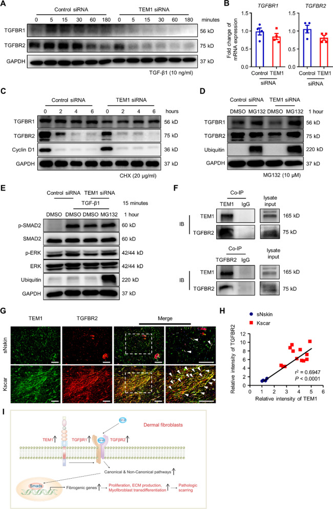 Results: The levels of the protein TEM1 are elevated in both hypertrophic scars and keloids in comparison to normal skin. A re-analysis of scRNA-seq datasets reveals that a major profibrotic subpopulation of keloid and hypertrophic scar fibroblasts greatly expresses TEM1, with expression increasing during fibroblast activation. TEM1 promotes activation, proliferation, and ECM production in human dermal fibroblasts by enhancing TGF-β1 signaling through binding with and stabilizing TGF-β receptors. Global deletion of Tem1 markedly reduces the amount of ECM synthesis and inflammation in a scar in a mouse model of stretch-induced pathologic scarring. The intralesional administration of ontuxizumab, a humanized IgG monoclonal antibody targeting TEM1, significantly decreased both the size and collagen density of keloids.