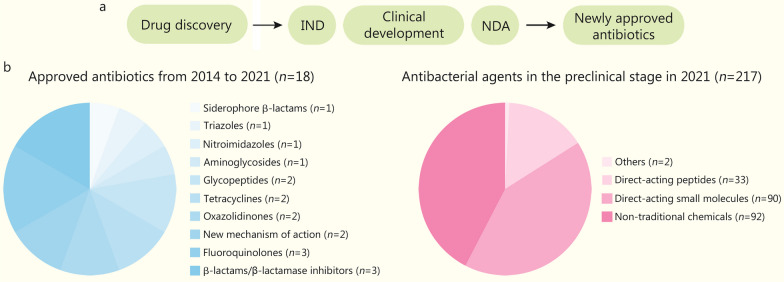 Antimicrobial resistance is a global public health threat, and the World Health Organization (WHO) has announced a priority list of the most threatening pathogens against which novel antibiotics need to be developed. The discovery and introduction of novel antibiotics are time-consuming and expensive. According to WHO's report of antibacterial agents in clinical development, only 18 novel antibiotics have been approved since 2014. Therefore, novel antibiotics are critically needed. Artificial intelligence (AI) has been rapidly applied to drug development since its recent technical breakthrough and has dramatically improved the efficiency of the discovery of novel antibiotics. Here, we first summarized recently marketed novel antibiotics, and antibiotic candidates in clinical development. In addition, we systematically reviewed the involvement of AI in antibacterial drug development and utilization, including small molecules, antimicrobial peptides, phage therapy, essential oils, as well as resistance mechanism prediction, and antibiotic stewardship.