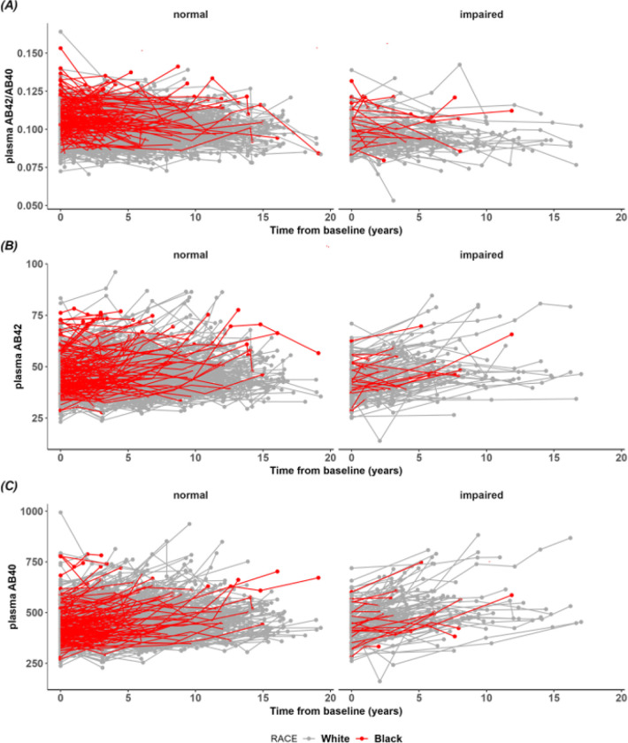 Baseline levels and longitudinal rates of change in plasma Aβ42/40 among self-identified Black/African American and White individuals