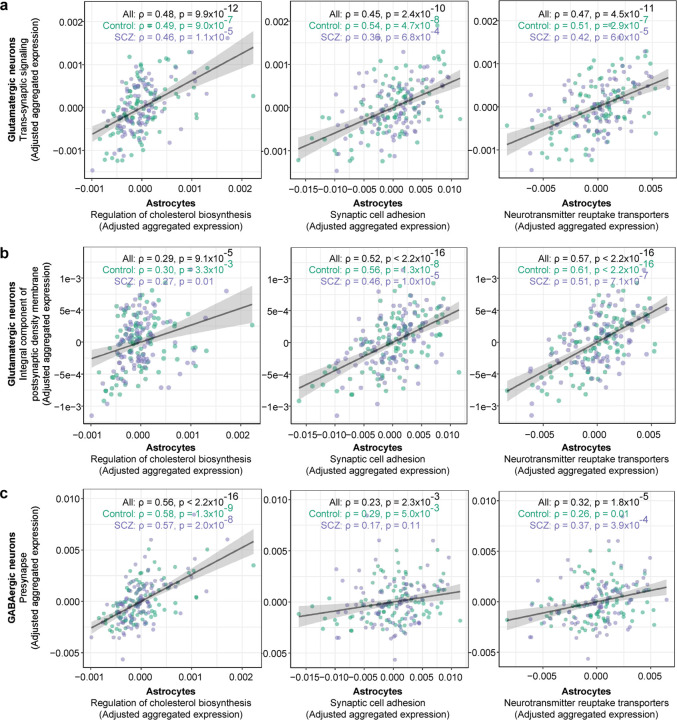 Human brains vary across people and over time; such variation is not yet understood in cellular terms. Here we describe a striking relationship between people's cortical neurons and cortical astrocytes. We used single-nucleus RNA-seq to analyze the prefrontal cortex of 191 human donors ages 22-97 years, including healthy individuals and persons with schizophrenia. Latent-factor analysis of these data revealed that in persons whose cortical neurons more strongly expressed genes for synaptic components, cortical astrocytes more strongly expressed distinct genes with synaptic functions and genes for synthesizing cholesterol, an astrocyte-supplied component of synaptic membranes. We call this relationship the Synaptic Neuron-and-Astrocyte Program (SNAP). In schizophrenia and aging - two conditions that involve declines in cognitive flexibility and plasticity 1,2 - cells had divested from SNAP: astrocytes, glutamatergic (excitatory) neurons, and GABAergic (inhibitory) neurons all reduced SNAP expression to corresponding degrees. The distinct astrocytic and neuronal components of SNAP both involved genes in which genetic risk factors for schizophrenia were strongly concentrated. SNAP, which varies quantitatively even among healthy persons of similar age, may underlie many aspects of normal human interindividual differences and be an important point of convergence for multiple kinds of pathophysiology.