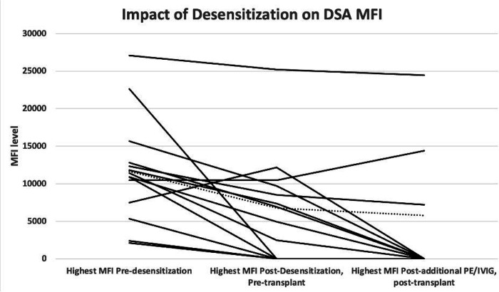 In patients requiring haploidentical hematopoietic cell transplant (haplo-HCT), the presence of donor specific anti-HLA antibodies (DSAs) is associated with high rates of primary graft failure and poor overall survival (OS). There is limited data regarding the effect of desensitization. Adult patients undergoing haplo-HCT at Washington University School of Medicine from 2009-2021 were identified. Patients were divided into three cohorts: no DSA, untreated DSA or treated DSA. DSA testing was performed. Desensitization therapy using plasmapheresis and IVIg (immunoglobulin) was performed. We retrospectively identified 304 patients for study inclusion. 14 of 30 patients with DSAs underwent desensitization. By day +2, 57% of patients cleared all DSAs. OS was expectedly worse in patients with untreated DSAs. There were similar results between treated DSA and patients without DSA (OS median: control: 352 days vs. treated: 1331 days vs. untreated: 137 days, p = 0.02). RFS was also significantly different between the groups however with similar RFS in treated DSA and control groups (RFS median: control: 248 vs. treated: 322 v. untreated: 119, p = 0.03). Desensitization before haplo-HCT produces similar outcomes to patients without DSAs. While the optimal desensitization protocol has not been established, all patients received a backbone of plasmapheresis and immunoglobulin.