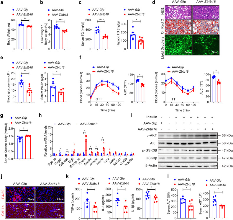 A lasting imbalance between fatty acid synthesis and consumption leads to non-alcoholic fatty liver disease (NAFLD), coupled with hepatitis and insulin resistance. Yet the details of the underlying mechanisms are not fully understood. Here, we unraveled that the expression of the transcription factor Zbtb18 is markedly decreased in the livers of both patients and murine models of NAFLD. Hepatic Zbtb18 knockout promoted NAFLD features like impaired energy expenditure and fatty acid oxidation (FAO), and induced insulin resistance. Conversely, hepatic Zbtb18 overexpression alleviated hepato-steatosis, insulin resistance, and hyperglycemia in mice fed on a high-fat diet (HFD) or in diabetic mice. Notably, in vitro and in vivo mechanistic studies revealed that Zbtb18 transcriptional activation of Farnesoid X receptor (FXR) mediated FAO and Clathrin Heavy Chain (CLTC) protein hinders NLRP3 inflammasome activity. This key mechanism by which hepatocyte's Zbtb18 expression alleviates NAFLD and consequent liver fibrosis was further verified by FXR's deletion and forced expression in mice and cultured mouse primary hepatocytes (MPHs). Moreover, CLTC deletion significantly abrogated the hepatic Zbtb18 overexpression-driven inhibition of NLRP3 inflammasome activity in macrophages. Altogether, Zbtb18 transcriptionally activates the FXR-mediated FAO and CLTC expression, which inhibits NLRP3 inflammasome's activity alleviating inflammatory stress and insulin resistance, representing an attractive remedy for hepatic steatosis and fibrosis.
