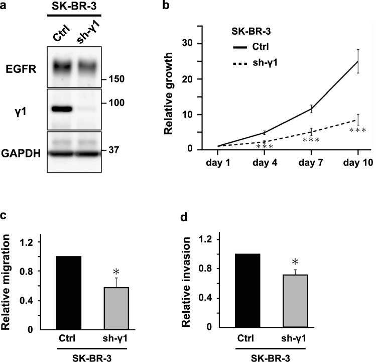 Results: Cell growth, migration, and invasion of SK-BR-3 cells were significantly suppressed by the depletion of γ1-adaptin. Although the staining patterns in the cancer tissues varied among cases by IHC, double IHF demonstrated that γ1-adaptin was mainly localized in EEA1-positive endosomes, but not in the TGN. γ1-Adaptin intensity was significantly higher in the tumor regions than in non-tumor regions. It was also higher in patients with Ki-67 (high), ER (-), PgR (-), and HER2 (+). Among subtypes of breast cancer, γ1-adaptin intensity was higher in HER2 than in luminal A or luminal B. The results of the survival analysis indicated that high γ1-adaptin intensity was significantly associated with worse RFS, and this association was also observed in group with ER (+), PgR (+), HER2 (-), Ki-67 (high), or luminal B. In addition, the Cox proportional hazards model showed that high γ1-adaptin intensity was an independent prognostic factor.
