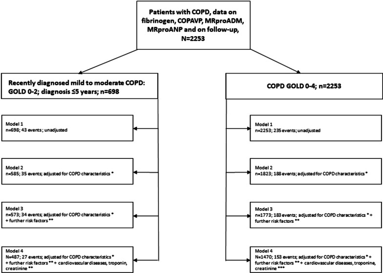 Methods: The blood biomarkers considered were copeptin (COPAVP), midregional adrenomedullin (MRproADM), midregional proatrial naturetic peptide (MRproANP), and fibrinogen. Analyses were performed in patients with stable "recently diagnosed mild to moderate COPD" defined by GOLD grades 0-2 and diagnosis of COPD ≤ 5 years prior to inclusion into the COSYCONET cohort (COPD and Systemic Consequences-Comorbidities Network), using Cox regression analysis with stepwise adjustment for multiple COPD characteristics, comorbidities, troponin and NT-proBNP.