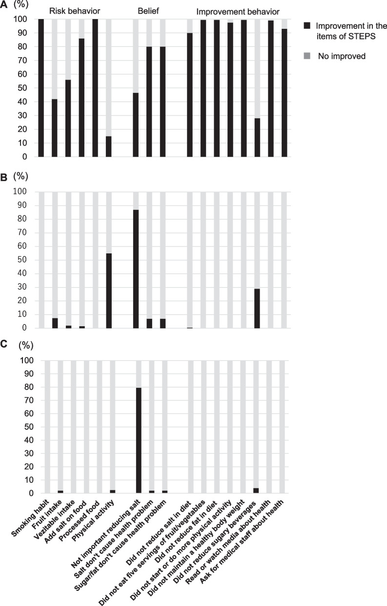 Methods: Six villages in the Narail district in Bangladesh were selected, two each in the first and second intervention and the control groups, in the Narail district in Bangladesh were selected. Pre- and post-intervention survey data were collected. The first intervention group received the "strong" educational intervention that included a checklist poster on the wall, phone call messages, personalized advice papers, seminar videos, and face-to-face seminars. The second intervention group received a "weak" intervention that included only a checklist poster on the wall in their house. The outcome was the proportion of NCDs and changes in systolic blood pressure and blood sugar level. Confidential fixed-effects logistic regression and multiple linear regression were performed to identify the effectiveness of the intervention.