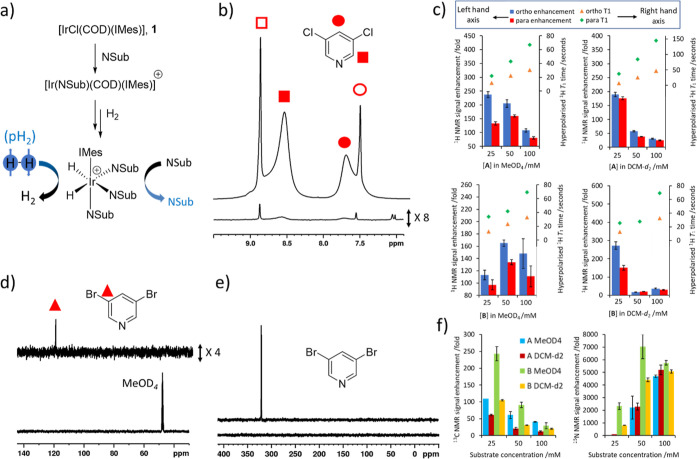 The neutral catalysts [IrCl(H)2(NHC)(substrate)2] or [IrCl(H)2(NHC)(substrate)(sulfoxide)] are used to transfer polarization from para hydrogen (pH2) to 3,5-dichloropyridine and 3,5-dibromopyridine substrates. This is achieved in a rapid, reversible, and low-cost process that relies on ligand exchange within the active catalyst. Notably, the sulfoxide-containing catalyst systems produced NMR signal enhancements between 1 and 2 orders of magnitude larger than its unmodified counterpart. Consequently, this signal amplification by reversible exchange hyperpolarization method can boost the 1H, 13C, and 15N nuclear magnetic resonance (NMR) signal intensities by factors up to 4350, 1550, and 46,600, respectively (14.0, 1.3, and 15.4% polarization). In this paper, NMR and X-ray crystallography are used to map the evolution of catalytically important species and provide mechanistic rational for catalytic efficiency. Furthermore, applications in spontaneous radiofrequency amplification by stimulated emission and NMR reaction monitoring are also shown.