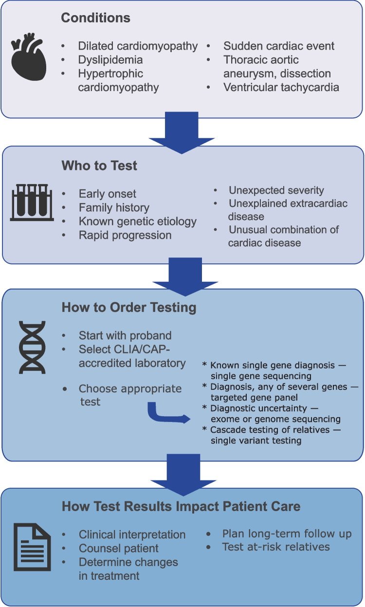 Recent findings: Precision diagnosis enables efficient management, appropriate use of emerging targeted therapies, and follow-up of at-risk family members. Genetic testing for these conditions is widely available but under-utilized. In this review, we summarize the potential benefits of genetic testing, highlighting the specific cardiovascular disease phenotypes in which genetic testing should be considered, and how clinicians can integrate guideline-directed genetic testing into their practice.