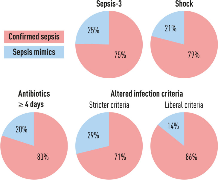 Conclusions: One-fourth of a presumed ICU sepsis population identified with the sepsis-3 criteria could be considered sepsis mimics. The high proportion of sepsis mimics has a potential dilutional effect on the presumed sepsis population, which threatens the validity of results from sepsis studies using recommended sepsis criteria.