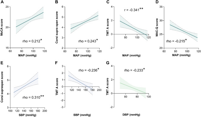 Results: Lower values of systolic BP (SBP), diastolic BP (DBP), and mean arterial pressure (MAP) were associated with poorer cognitive performance. Notably, MAP showed greater capability in detecting impairments in attention and visuospatial abilities compared to SBP and DBP.
