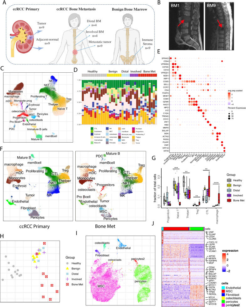 Methods: We collected fresh patient samples and performed single-cell transcriptomic profiling of solid metastatic tissue (Bone Met), liquid bone marrow at the vertebral level of spinal cord compression (Involved), and liquid bone marrow from a different vertebral body distant from the tumor site but within the surgical field (Distal), as well as bone marrow from patients undergoing hip replacement surgery (Benign). In addition, we incorporated single-cell data from primary ccRCC tumors (ccRCC Primary) for comparative analysis.