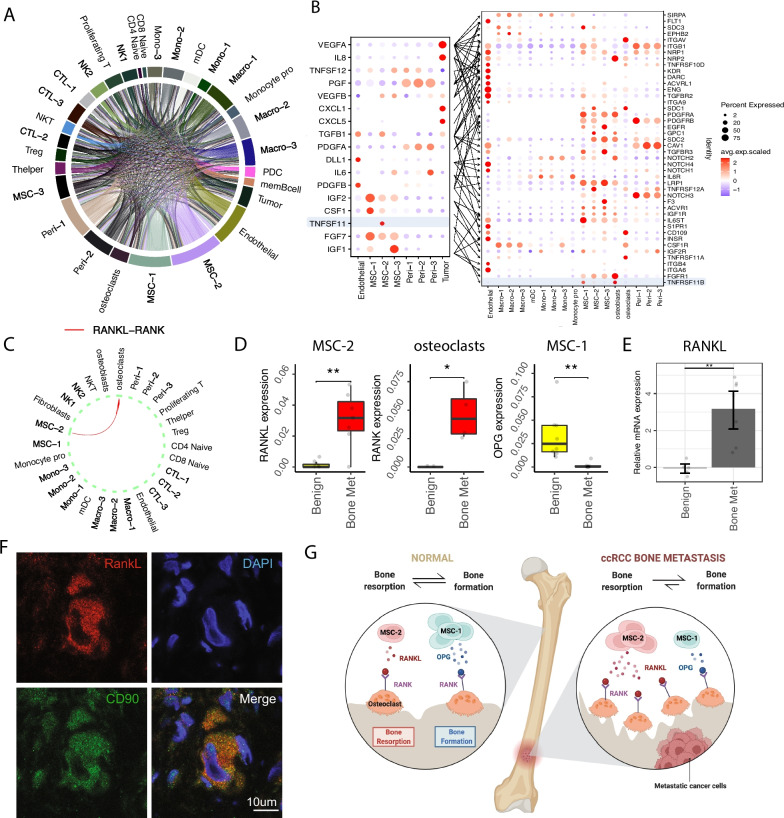 Results: The bone marrow of metastatic patients is immune-suppressive, featuring increased, exhausted CD8 + cytotoxic T cells, T regulatory cells, and tumor-associated macrophages (TAM) with distinct transcriptional states in metastatic lesions. Bone marrow stroma from tumor samples demonstrated a tumor-associated mesenchymal stromal cell population (TA-MSC) that appears to be supportive of epithelial-to mesenchymal transition (EMT), bone remodeling, and a cancer-associated fibroblast (CAFs) phenotype. This stromal subset is associated with poor progression-free and overall survival and also markedly upregulates bone remodeling through the dysregulation of RANK/RANKL/OPG signaling activity in bone cells, ultimately leading to bone resorption.