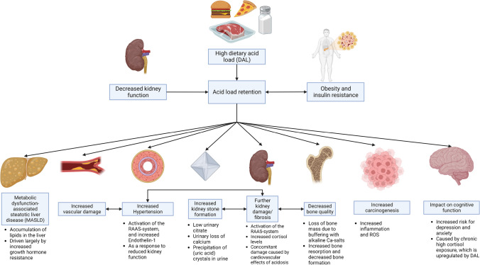 Maintaining an appropriate acid-base equilibrium is crucial for human health. A primary influencer of this equilibrium is diet, as foods are metabolized into non-volatile acids or bases. Dietary acid load (DAL) is a measure of the acid load derived from diet, taking into account both the potential renal acid load (PRAL) from food components like protein, potassium, phosphorus, calcium, and magnesium, and the organic acids from foods, which are metabolized to bicarbonate and thus have an alkalinizing effect. Current Western diets are characterized by a high DAL, due to large amounts of animal protein and processed foods. A chronic low-grade metabolic acidosis can occur following a Western diet and is associated with increased morbidity and mortality. Nutritional advice focusing on DAL, rather than macronutrients, is gaining rapid attention as it provides a more holistic approach to managing health. However, current evidence for the role of DAL is mainly associative, and underlying mechanisms are poorly understood. This review focusses on the role of DAL in multiple conditions such as obesity, cardiovascular health, impaired kidney function, and cancer.
