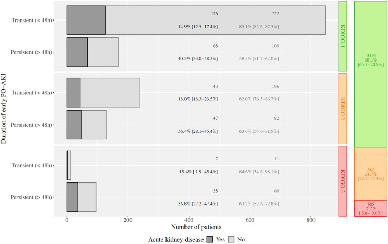 Results: We studied 9510 patients without pre-existing CKD. Of these, 940 (9.9%) developed AKD after 7 days of whom 34.1% experiencing an episode of early postoperative-AKI. Rates of AKD after 7 days significantly increased with the severity (19.1% Kidney Disease Improving Global Outcomes [KDIGO] 1, 24.5% KDIGO2, 34.3% KDIGO3; P < 0.001) and duration (15.5% transient vs 38.3% persistent AKI; P < 0.001) of early postoperative-AKI. Independent risk factors for AKD included early postoperative-AKI, exposure to perioperative nephrotoxic agents, and postoperative pneumonia. Early postoperative-AKI carried an independent odds ratio for AKD of 2.64 (95% confidence interval [CI] 2.21-3.15). Of 663 patients with pre-existing CKD, 42 (6.3%) had worsening CKD at day 90. In patients with CKD and an episode of early AKI, CKD progression occurred in 11.6%.