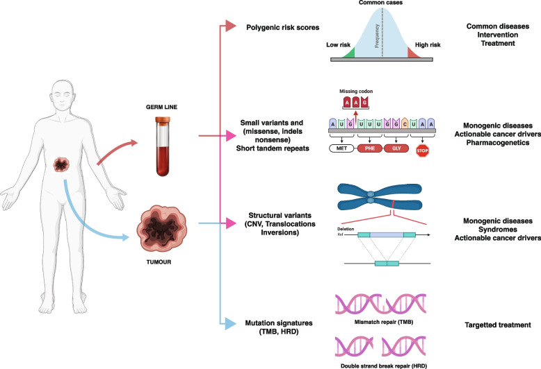 Whole genome sequencing (WGS) is becoming the preferred method for molecular genetic diagnosis of rare and unknown diseases and for identification of actionable cancer drivers. Compared to other molecular genetic methods, WGS captures most genomic variation and eliminates the need for sequential genetic testing. Whereas, the laboratory requirements are similar to conventional molecular genetics, the amount of data is large and WGS requires a comprehensive computational and storage infrastructure in order to facilitate data processing within a clinically relevant timeframe. The output of a single WGS analyses is roughly 5 MIO variants and data interpretation involves specialized staff collaborating with the clinical specialists in order to provide standard of care reports. Although the field is continuously refining the standards for variant classification, there are still unresolved issues associated with the clinical application. The review provides an overview of WGS in clinical practice - describing the technology and current applications as well as challenges connected with data processing, interpretation and clinical reporting.