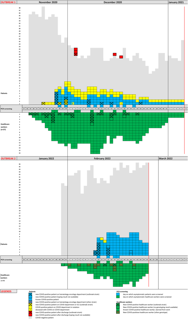 Two SARS-CoV-2 nosocomial outbreaks occurred on the haematology ward of our hospital. Patients on the ward were at high risk for severe infection because of their immunocompromised status. Whole Genome Sequencing proved transmission of a particular SARS-CoV-2 variant in each outbreak. The first outbreak (20 patients/31 healthcare workers (HCW)) occurred in November 2020 and was caused by a variant belonging to lineage B.1.221. At that time, there were still uncertainties on mode of transmission of SARS-CoV-2, and vaccines nor therapy were available. Despite HCW wearing II-R masks in all patient contacts and FFP-2 masks during aerosol generating procedures (AGP), the outbreak continued. Therefore, extra measures were introduced. Firstly, regular PCR-screening of asymptomatic patients and HCW; positive patients were isolated and positive HCW were excluded from work as a rule and they were only allowed to resume their work if a follow-up PCR CT-value was ≥30 and were asymptomatic or having only mild symptoms. Secondly, the use of FFP-2 masks was expanded to some long-lasting, close-contact, non-AGPs. After implementing these measures, the incidence of new cases declined gradually. Thirty-seven percent of patients died due to COVID-19. The second outbreak (10 patients/2 HCW) was caused by the highly transmissible omicron BA.1 variant and occurred in February 2022, where transmission occurred on shared rooms despite the extra infection control measures. It was controlled much faster, and the clinical impact was low as the majority of patients was vaccinated; no patients died and symptoms were relatively mild in both patients and HCW.