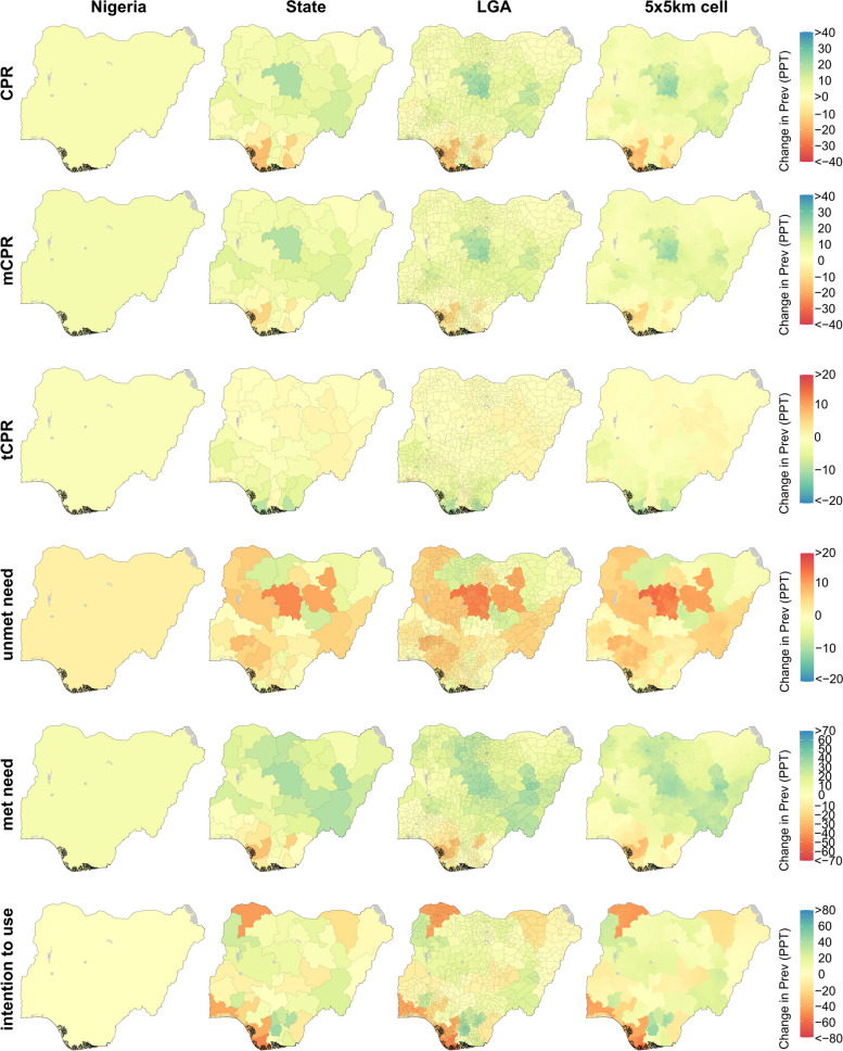 Conclusions: Despite substantial increases in contraceptive use, too many women still have an unmet need for modern methods of contraception. Moreover, country-level estimates of family planning indicators obscure important differences among locations within the same country. The modelling approach described here enables estimating family planning indicators at a subnational level and could be readily adapted to estimate subnational trends in family planning indicators in other countries. These estimates provide a tool for better understanding local needs and informing continued efforts to ensure universal access to sexual and reproductive healthcare services.
