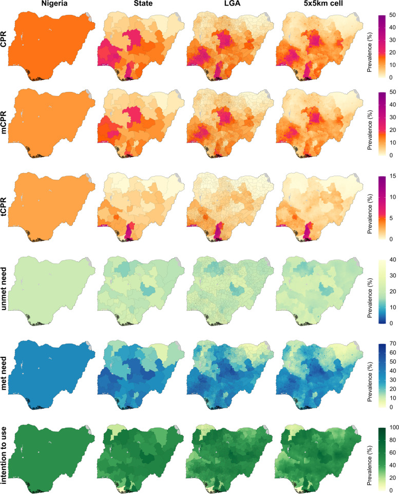 Methods: We used a Bayesian geostatistical modelling framework to analyse geo-located data on contraceptive use and family planning from 61 household surveys in Burkina Faso, Kenya, and Nigeria in order to generate subnational estimates of prevalence and associated uncertainty for six indicators from 2000 to 2020: contraceptive prevalence rate (CPR), modern contraceptive prevalence rate (mCPR), traditional contraceptive prevalence rate (tCPR), unmet need for modern methods of contraception, met need for family planning with modern methods, and intention to use contraception. For each country and indicator, we generated estimates at an approximately 5 × 5-km resolution and at the first and second administrative levels (regions and provinces in Burkina Faso; counties and sub-counties in Kenya; and states and local government areas in Nigeria).