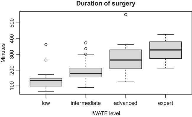 Methods: Based on the prospective database of the Interdisciplinary Robotic Center of Ulm University Hospital, the first 100 robotic liver surgeries were identified and analyzed. Perioperative parameters (duration of surgery and blood loss) and postoperative parameters including morbidity, mortality, and length of hospital stay were assessed and the results were compared between different IWATE difficulty categories.