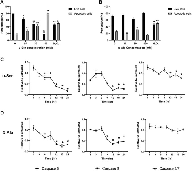 Studies in vivo have demonstrated that the accumulation of D-amino acids (D-AAs) is associated with age-related diseases and increased immune activation. However, the underlying mechanism(s) of these observations are not well defined. The metabolism of D-AAs by D-amino oxidase (DAO) produces hydrogen peroxide (H2O2), a reactive oxygen species involved in several physiological processes including immune response, cell differentiation, and proliferation. Excessive levels of H2O2 contribute to oxidative stress and eventual cell death, a characteristic of age-related pathology. Here, we explored the molecular mechanisms of D-serine (D-Ser) and D-alanine (D-Ala) in human liver cancer cells, HepG2, with a focus on the production of H2O2 the downstream secretion of pro-inflammatory cytokine and chemokine, and subsequent cell death. In HepG2 cells, we demonstrated that D-Ser decreased H2O2 production and induced concentration-dependent depolarization of mitochondrial membrane potential (MMP). This was associated with the upregulation of activated NF-кB, pro-inflammatory cytokine, TNF-α, and chemokine, IL-8 secretion, and subsequent apoptosis. Conversely, D-Ala-treated cells induced H2O2 production, and were also accompanied by the upregulation of activated NF-кB, TNF-α, and IL-8, but did not cause significant apoptosis. The present study confirms the role of both D-Ser and D-Ala in inducing inflammatory responses, but each via unique activation pathways. This response was associated with apoptotic cell death only with D-Ser. Further research is required to gain a better understanding of the mechanisms underlying D-AA-induced inflammation and its downstream consequences, especially in the context of aging given the wide detection of these entities in systemic circulation.
