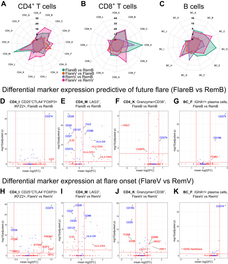 Immune-mediated inflammatory diseases (IMIDs) are typically characterised by relapsing and remitting flares of inflammation. However, the unpredictability of disease flares impedes their study. Addressing this critical knowledge gap, we use the experimental medicine approach of immunomodulatory drug withdrawal in rheumatoid arthritis (RA) remission to synchronise flare processes allowing detailed characterisation. Exploratory mass cytometry analyses reveal three circulating cellular subsets heralding the onset of arthritis flare - CD45RO+PD1hi CD4+ and CD8+ T cells, and CD27+CD86+CD21- B cells - further characterised by single-cell sequencing. Distinct lymphocyte subsets including cytotoxic and exhausted CD4+ memory T cells, memory CD8+CXCR5+ T cells, and IGHA1+ plasma cells are primed for activation in flare patients. Regulatory memory CD4+ T cells (Treg cells) increase at flare onset, but with dysfunctional regulatory marker expression compared to drug-free remission. Significant clonal expansion is observed in T cells, but not B cells, after drug cessation; this is widespread throughout memory CD8+ T cell subsets but limited to the granzyme-expressing cytotoxic subset within CD4+ memory T cells. Based on our observations, we suggest a model of immune dysregulation for understanding RA flare, with potential for further translational research towards novel avenues for its treatment and prevention.