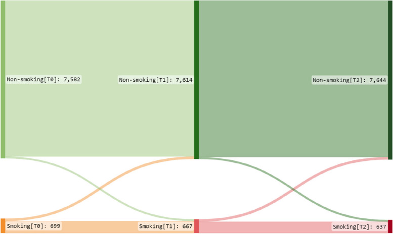 Conclusions: Smoking was associated with severe psychological distress, advanced age, and hazardous alcohol use at baseline; non-smoking was associated with high education, working from home, and high physical activity. Nevertheless, the smoking rate among individuals experiencing severe psychological distress slightly decreased over the course of the COVID-19 pandemic.