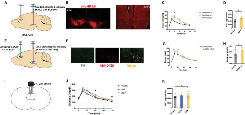 The brain neurotramsmitter dopamine may play an important role in modulating systemic glucose homeostasis. In seven hundred and four drug- naïve patients with first-episode schizophrenia, we provide robust evidence of positive associations between negative symptoms of schizophrenia and high fasting blood glucose. We then show that glucose metabolism and negative symptoms are improved when intermittent theta burst stimulation (iTBS) on prefrontal cortex (PFC) is performed in patients with predominantly negative symptoms of schizophrenia. These findings led us to hypothesize that the prefrontal cortical dopamine deficit, which is known to be associated with negative symptoms, may be responsible for abnormal glucose metabolism in schizophrenia. To explore this, we optogenetically and chemogenetically inhibited the ventral tegmental area (VTA)-medial prefrontal cortex (mPFC) dopamine projection in mice and found both procedures caused glucose intolerance. Moreover, microinjection of dopamine two receptor (D2R) neuron antagonists into mPFC in mice significantly impaired glucose tolerance. Finally, a transgenic mouse model of psychosis named Disc1tr exhibited depressive-like symptoms, impaired glucose homeostasis, and compared to wild type littermates reduced D2R expression in prefrontal cortex.