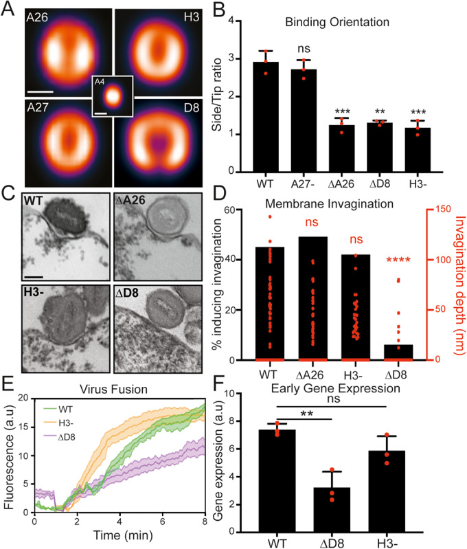 Cellular attachment of viruses determines their cell tropism and species specificity. For entry, vaccinia, the prototypic poxvirus, relies on four binding proteins and an eleven-protein entry fusion complex. The contribution of the individual virus binding proteins to virion binding orientation and membrane fusion is unclear. Here, we show that virus binding proteins guide side-on virion binding and promote curvature of the host membrane towards the virus fusion machinery to facilitate fusion. Using a membrane-bleb model system together with super-resolution and electron microscopy we find that side-bound vaccinia virions induce membrane invagination in the presence of low pH. Repression or deletion of individual binding proteins reveals that three of four contribute to binding orientation, amongst which the chondroitin sulfate binding protein, D8, is required for host membrane bending. Consistent with low-pH dependent macropinocytic entry of vaccinia, loss of D8 prevents virion-associated macropinosome membrane bending, disrupts fusion pore formation and infection. Our results show that viral binding proteins are active participants in successful virus membrane fusion and illustrate the importance of virus protein architecture for successful infection.