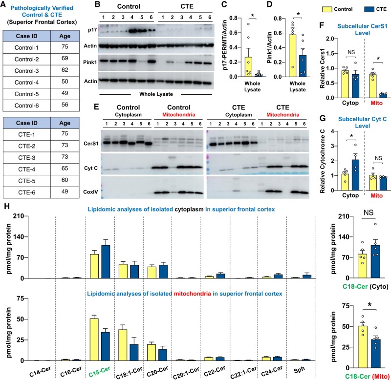 Repeat concussions (or repetitive mild traumatic brain injury [rmTBI]) are complex pathological processes consisting of a primary insult and long-term secondary complications and are also a prerequisite for chronic traumatic encephalopathy (CTE). Recent evidence implies a significant role of autophagy-mediated dysfunctional mitochondrial clearance, mitophagy, in the cascade of secondary deleterious events resulting from TBI. C18-ceramide, a bioactive sphingolipid produced in response to cell stress and damage, and its synthesizing enzyme (CerS1) are precursors to selective stress-mediated mitophagy. A transporter, p17, mediates the trafficking of CerS1, induces C18-ceramide synthesis in the mitochondrial membrane, and acts as an elimination signal in cell survival. Whether p17-mediated mitophagy occurs in the brain and plays a causal role in mitochondrial quality control in secondary disease development after rmTBI are unknown. Using a novel repetitive less-than-mild TBI (rlmTBI) injury paradigm, ablation of mitochondrial p17/C18-ceramide trafficking in p17 knockout (KO) mice results in a loss of C18-ceramide-induced mitophagy, which contributes to susceptibility and recovery from long-term secondary complications associated with rlmTBI. Using a ceramide analog with lipid-selenium conjugate drug, LCL768 restored mitophagy and reduced long-term secondary complications, improving cognitive deficits in rlmTBI-induced p17KO mice. We obtained a significant reduction of p17 expression and a considerable decrease of CerS1 and C18-ceramide levels in cortical mitochondria of CTE human brains compared with age-matched control brains. These data demonstrated that p17/C18-ceramide trafficking is an endogenous neuroprotective mitochondrial stress response following rlmTBI, thus suggesting a novel prospective strategy to interrupt the CTE consequences of concussive TBI.