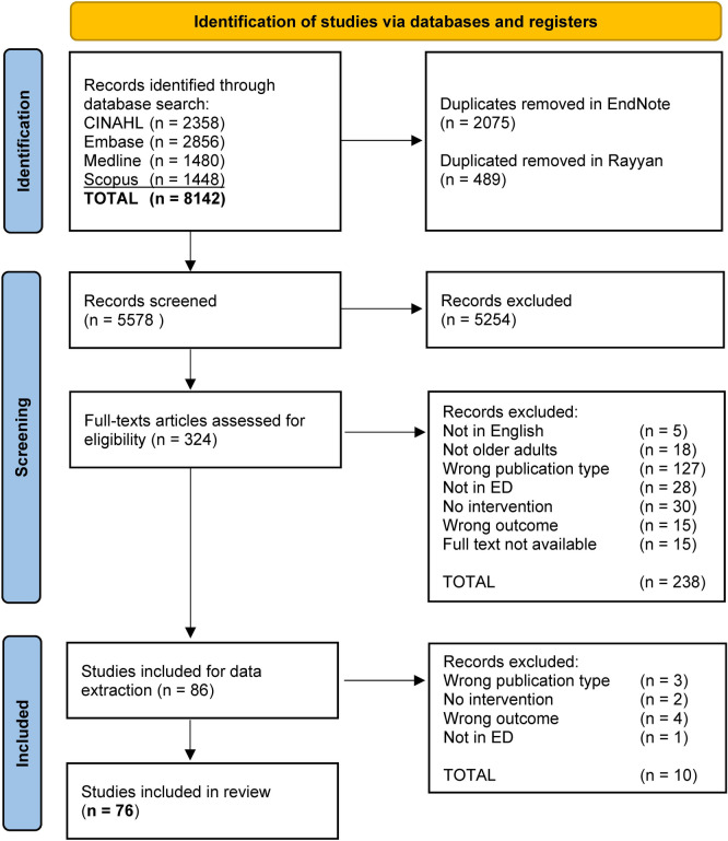 Results: Seventy-six studies were included in the review, incorporating strategies for comprehensive assessment and multi-faceted care (n = 32), targeted care such as management of falls risk, functional decline, or pain management (n = 27), medication safety (n = 5), and trauma care (n = 12). We found a misalignment between comprehensive care delivered in ED for older adults and ED performance measures oriented to rapid assessment and referral. Eight (10.4%) studies reported patient experience and five (6.5%) reported staff experience.