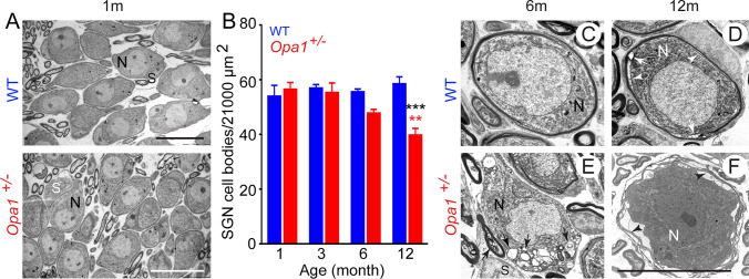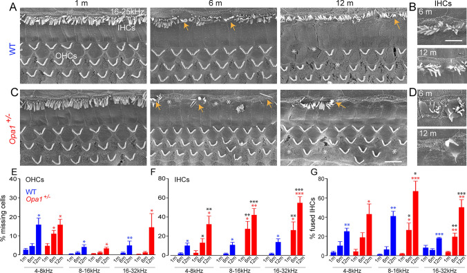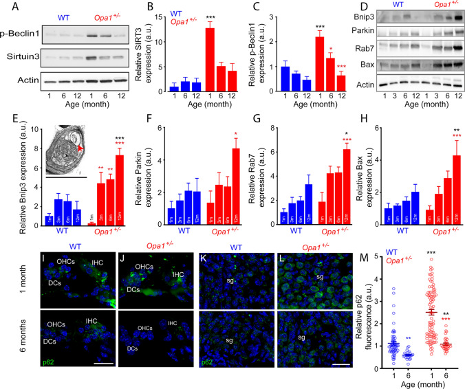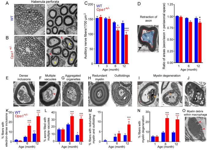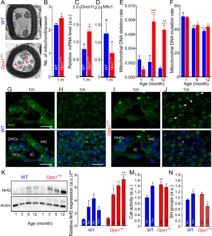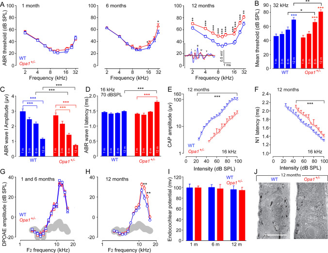 Dominant optic atrophy (DOA) is one of the most prevalent forms of hereditary optic neuropathies and is mainly caused by heterozygous variants in OPA1, encoding a mitochondrial dynamin-related large GTPase. The clinical spectrum of DOA has been extended to a wide variety of syndromic presentations, called DOAplus, including deafness as the main secondary symptom associated to vision impairment. To date, the pathophysiological mechanisms underlying the deafness in DOA remain unknown. To gain insights into the process leading to hearing impairment, we have analyzed the Opa1delTTAG mouse model that recapitulates the DOAplus syndrome through complementary approaches combining morpho-physiology, biochemistry, and cellular and molecular biology. We found that Opa1delTTAG mutation leads an adult-onset progressive auditory neuropathy in mice, as attested by the auditory brainstem response threshold shift over time. However, the mutant mice harbored larger otoacoustic emissions in comparison to wild-type littermates, whereas the endocochlear potential, which is a proxy for the functional state of the stria vascularis, was comparable between both genotypes. Ultrastructural examination of the mutant mice revealed a selective loss of sensory inner hair cells, together with a progressive degeneration of the axons and myelin sheaths of the afferent terminals of the spiral ganglion neurons, supporting an auditory neuropathy spectrum disorder (ANSD). Molecular assessment of cochlea demonstrated a reduction of Opa1 mRNA level by greater than 40%, supporting haploinsufficiency as the disease mechanism. In addition, we evidenced an early increase in Sirtuin 3 level and in Beclin1 activity, and subsequently an age-related mtDNA depletion, increased oxidative stress, mitophagy as well as an impaired autophagic flux. Together, these results support a novel role for OPA1 in the maintenance of inner hair cells and auditory neural structures, addressing new challenges for the exploration and treatment of OPA1-linked ANSD in patients.