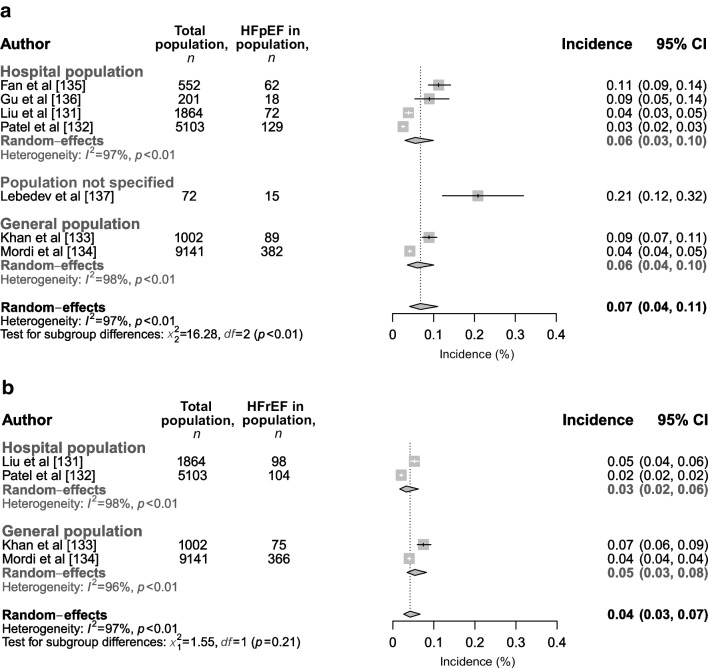 Left ventricular diastolic dysfunction (LVDD) without symptoms, and heart failure (HF) with preserved ejection fraction (HFpEF) represent the most common phenotypes of HF in individuals with type 2 diabetes mellitus, and are more common than HF with reduced ejection fraction (HFrEF), HF with mildly reduced ejection fraction (HFmrEF) and left ventricular systolic dysfunction (LVSD) in these individuals. However, diagnostic criteria for HF have changed over the years, resulting in heterogeneity in the prevalence/incidence rates reported in different studies. We aimed to give an overview of the diagnosis and epidemiology of HF in type 2 diabetes, using both a narrative and systematic review approach; we focus narratively on diagnosing (using the 2021 European Society of Cardiology [ESC] guidelines) and screening for HF in type 2 diabetes. We performed an updated (2016-October 2022) systematic review and meta-analysis of studies reporting the prevalence and incidence of HF subtypes in adults ≥18 years with type 2 diabetes, using echocardiographic data. Embase and MEDLINE databases were searched and data were assessed using random-effects meta-analyses, with findings presented as forest plots. From the 5015 studies found, 209 were screened using the full-text article. In total, 57 studies were included, together with 29 studies that were identified in a prior meta-analysis; these studies reported on the prevalence of LVSD (n=25 studies, 24,460 individuals), LVDD (n=65 studies, 25,729 individuals), HFrEF (n=4 studies, 4090 individuals), HFmrEF (n=2 studies, 2442 individuals) and/or HFpEF (n=8 studies, 5292 individuals), and on HF incidence (n=7 studies, 17,935 individuals). Using Hoy et al's risk-of-bias tool, we found that the studies included generally had a high risk of bias. They showed a prevalence of 43% (95% CI 37%, 50%) for LVDD, 17% (95% CI 7%, 35%) for HFpEF, 6% (95% CI 3%, 10%) for LVSD, 7% (95% CI 3%, 15%) for HFrEF, and 12% (95% CI 7%, 22%) for HFmrEF. For LVDD, grade I was found to be most prevalent. Additionally, we reported a higher incidence rate of HFpEF (7% [95% CI 4%, 11%]) than HFrEF 4% [95% CI 3%, 7%]). The evidence is limited by the heterogeneity of the diagnostic criteria over the years. The systematic section of this review provides new insights on the prevalence/incidence of HF in type 2 diabetes, unveiling a large pre-clinical target group with LVDD/HFpEF in which disease progression could be halted by early recognition and treatment.Registration PROSPERO ID CRD42022368035.