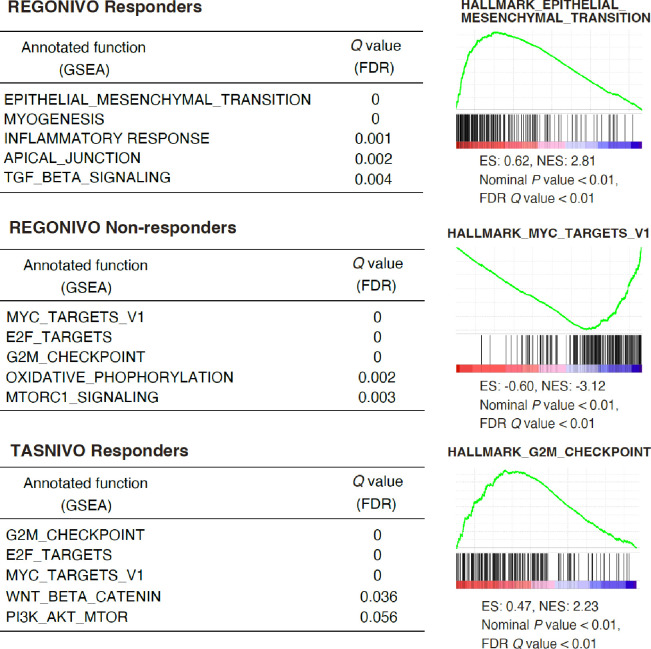 Results: The epithelial-mesenchymal transition pathway and genes related to cancer-associated fibroblasts were upregulated in the REGONIVO responder group, and the G2M checkpoint pathway was upregulated in the TASNIVO responder group. The MYC pathway was upregulated in the REGONIVO non-responder group. Consensus molecular subtype 4 was significantly associated with response (p=0.035) and longer progression-free survival (p=0.006) in the REGONIVO trial. CD8+ T cells, regulatory T cells, and M2 macrophages density was significantly higher in the REGONIVO trial responders than in non-responders. Mutations in the POLE gene and patient response were significantly associated in the TASNIVO trial; however, the frequencies of other mutations or tumor mutational burden were not significantly different between responders and non-responders in either trial.