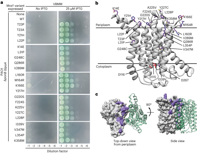 Many bacterial surface glycans such as the peptidoglycan (PG) cell wall are built from monomeric units linked to a polyprenyl lipid carrier. How this limiting carrier is distributed among competing pathways has remained unclear. Here we describe the isolation of hyperactive variants of Pseudomonas aeruginosa MraY, the enzyme that forms the first lipid-linked PG precursor. These variants result in the elevated production of the final PG precursor lipid II in cells and are hyperactive in vitro. The activated MraY variants have substitutions that map to a cavity on the extracellular side of the dimer interface, far from the active site. Our structural and molecular dynamics results suggest that this cavity is a binding site for externalized lipid II. Overall, our results support a model in which excess externalized lipid II allosterically inhibits MraY, providing a feedback mechanism that prevents the sequestration of lipid carrier in the PG biogenesis pathway.