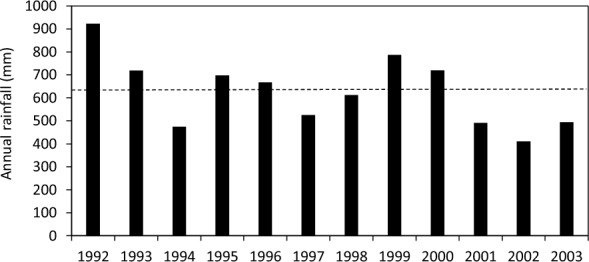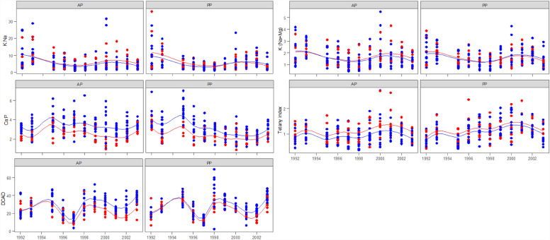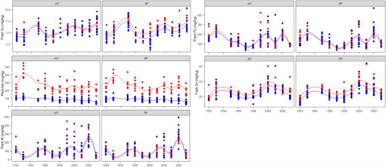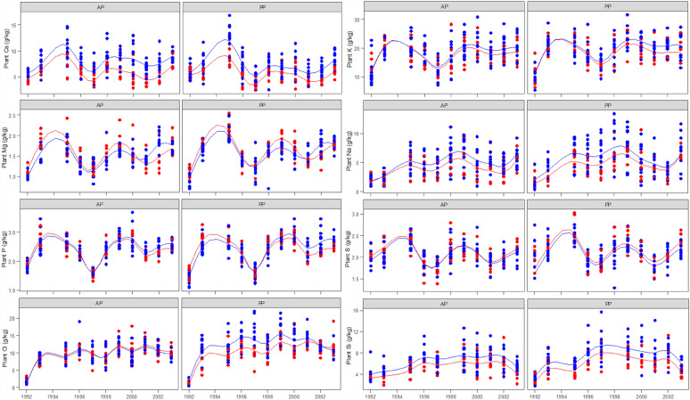 ) treatments in annual (AP) and perennial pastures (PP). The lines are spline-fitted with corresponding treatments. No plant samples were taken in 1994 due to the extreme drought condition.