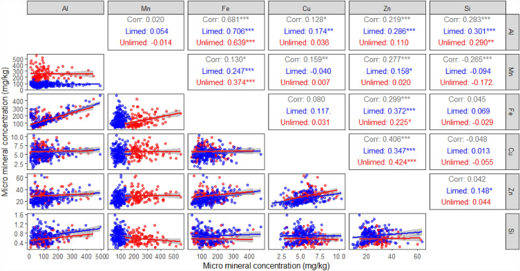 There is limited information on changes of pasture mineral concentrations over the long-term in response to liming. A long-term field experiment was conducted to assess the influence of lime application on (a) changes in pasture mineral composition over time; and (b) key pasture mineral concentrations and ratios important to animal health. Perennial and annual pastures with or without lime application were sampled annually over 12 years and analysed for macro- and micro-minerals. Mineral ratios and indices were calculated to assess the potential impact on animal health. Liming increased the concentrations of calcium, sodium and silicon, but decreased the concentrations of micro-nutrients including copper, zinc and manganese. The same trend was found in both annual and perennial pastures although there were some fluctuations between years. Liming increased the calcium:phosphorus ratio and the dietary cation-anion difference but reduced the tetany index on both annual and perennial pastures. These findings suggest a potential benefit to improve animal health outcomes for some disorders on the limed pastures. However, the reduced concentrations of some trace elements following liming potentially decreases antioxidant capacity and requires further research.