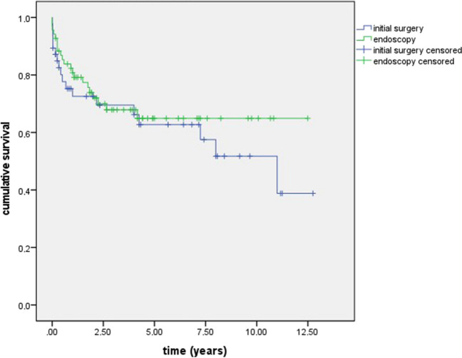 Methods: We included 114 patients, of whom 69 were treated with initial endoscopy and 45 by initial surgery. Both groups were further assessed for peri-interventional and long-term parameters.