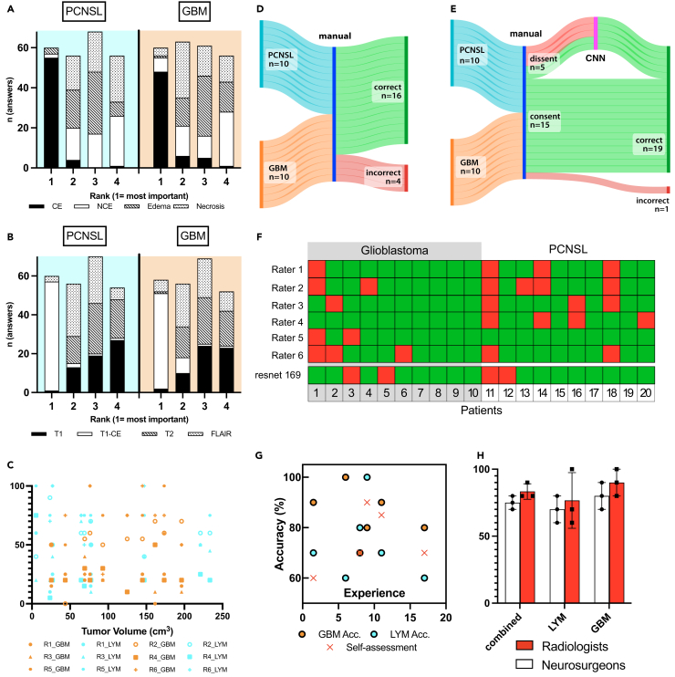 The preoperative distinction between glioblastoma (GBM) and primary central nervous system lymphoma (PCNSL) can be difficult, even for experts, but is highly relevant. We aimed to develop an easy-to-use algorithm, based on a convolutional neural network (CNN) to preoperatively discern PCNSL from GBM and systematically compare its performance to experienced neurosurgeons and radiologists. To this end, a CNN-based on DenseNet169 was trained with the magnetic resonance (MR)-imaging data of 68 PCNSL and 69 GBM patients and its performance compared to six trained experts on an external test set of 10 PCNSL and 10 GBM. Our neural network predicted PCNSL with an accuracy of 80% and a negative predictive value (NPV) of 0.8, exceeding the accuracy achieved by clinicians (73%, NPV 0.77). Combining expert rating with automated diagnosis in those cases where experts dissented yielded an accuracy of 95%. Our approach has the potential to significantly augment the preoperative radiological diagnosis of PCNSL.