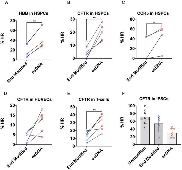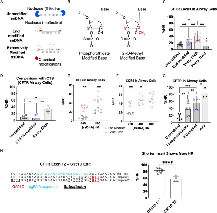 Single-stranded DNA (ssDNA) templates along with Cas9 have been used for gene insertion but suffer from low efficiency. Here, we show that ssDNA with chemical modifications in 10-17% of internal bases (eDNA) is compatible with the homologous recombination machinery. Moreover, eDNA templates improve gene insertion by 2-3 fold compared to unmodified and end-modified ssDNA in airway basal stem cells (ABCs), hematopoietic stem and progenitor cells (HSPCs), T-cells and endothelial cells. Over 50% of alleles showed gene insertion in three clinically relevant loci (CFTR, HBB, and CCR5) in ABCs using eDNA and up to 70% of alleles showed gene insertion in the HBB locus in HSPCs. This level of correction is therapeutically relevant and is comparable to adeno-associated virus-based templates. Knocking out TREX1 nuclease improved gene insertion using unmodified ssDNA but not eDNA suggesting that chemical modifications inhibit TREX1. This approach can be used for therapeutic applications and biological modeling.