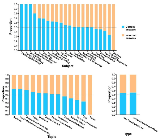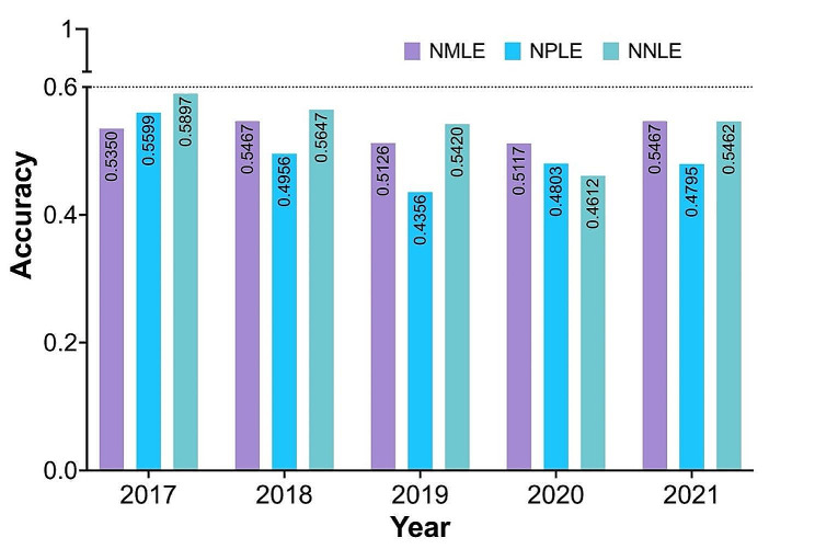 Results: ChatGPT failed to pass the accuracy threshold of 0.6 in any of the three types of examinations over the five years. Specifically, in the NMLE, the highest recorded accuracy was 0.5467, which was attained in both 2018 and 2021. In the NPLE, the highest accuracy was 0.5599 in 2017. In the NNLE, the most impressive result was shown in 2017, with an accuracy of 0.5897, which is also the highest accuracy in our entire evaluation. ChatGPT's performance showed no significant difference in different units, but significant difference in different question types. ChatGPT performed well in a range of subject areas, including clinical epidemiology, human parasitology, and dermatology, as well as in various medical topics such as molecules, health management and prevention, diagnosis and screening.