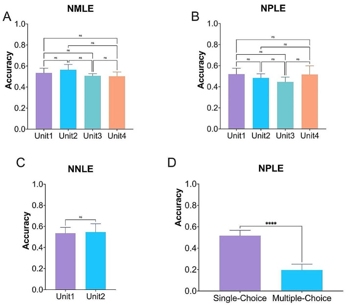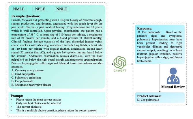 Methods: We collected questions from Chinese NMLE, NPLE and NNLE from year 2017 to 2021. In NMLE and NPLE, each exam consists of 4 units, while in NNLE, each exam consists of 2 units. The questions with figures, tables or chemical structure were manually identified and excluded by clinician. We applied direct instruction strategy via multiple prompts to force ChatGPT to generate the clear answer with the capability to distinguish between single-choice and multiple-choice questions.