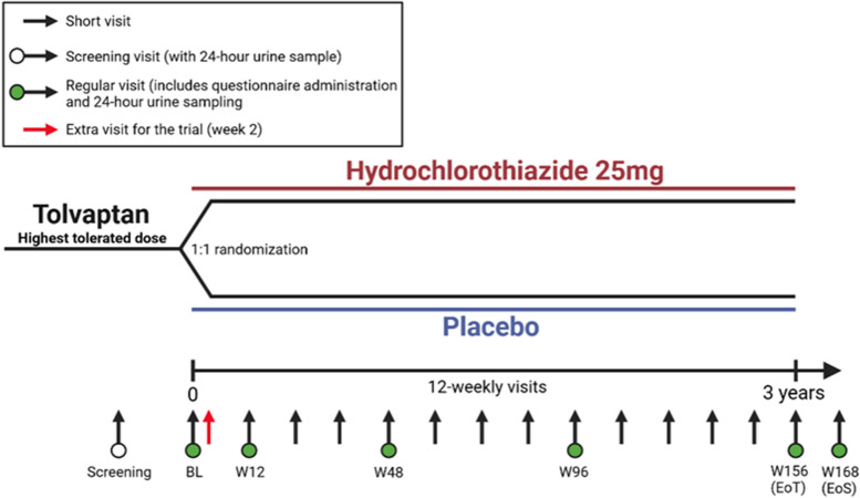Outcomes: The primary study outcome is the rate of kidney function decline (expressed as eGFR slope, in mL/min/1.73 m2 per year) in HCT versus placebo-treated patients, calculated by linear mixed model analysis using all available creatinine values from week 12 until the end of treatment. Secondary outcomes include changes in quality-of-life questionnaire scores (TIPS, ADPKD-UIS, EQ-5D-5L, SF-12) and changes in 24-h urine volume.