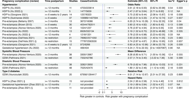 Results: Ten systematic reviews were included. Two pregnancy complications were identified. Gestational diabetes mellitus (GDM): One review showed GDM was associated with a 10-fold higher risk of T2DM at least 1 year after pregnancy (relative risk (RR) 9.51 (95% confidence interval (CI) 7.14 to 12.67) and although the association differed by ethnicity (white: RR 16.28 (95% CI 15.01 to 17.66), non-white: RR 10.38 (95% CI 4.61 to 23.39), mixed: RR 8.31 (95% CI 5.44 to 12.69)), the between subgroups difference were not statistically significant at 5% significance level. Another review showed GDM was associated with higher mean blood pressure at least 3 months postpartum (mean difference in systolic blood pressure: 2.57 (95% CI 1.74 to 3.40) mmHg and mean difference in diastolic blood pressure: 1.89 (95% CI 1.32 to 2.46) mmHg). Hypertensive disorders of pregnancy (HDP): Three reviews showed women with a history of HDP were 3 to 6 times more likely to develop hypertension at least 6 weeks after pregnancy compared to women without HDP (meta-analysis with largest number of studies: odds ratio (OR) 4.33 (3.51 to 5.33)) and one review reported a higher rate of T2DM after HDP (hazard ratio (HR) 2.24 (1.95 to 2.58)) at least a year after pregnancy. One of the three reviews and five other reviews reported women with a history of preeclampsia were 3 to 7 times more likely to develop hypertension at least 6 weeks postpartum (meta-analysis with the largest number of studies: OR 3.90 (3.16 to 4.82) with one of these reviews reporting the association was greatest in women from Asia (Asia: OR 7.54 (95% CI 2.49 to 22.81), Europe: OR 2.19 (95% CI 0.30 to 16.02), North and South America: OR 3.32 (95% CI 1.26 to 8.74)).
