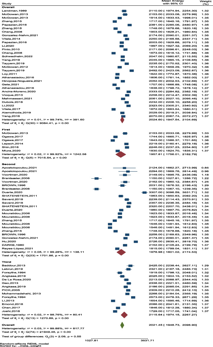 Results: Among 7081 published articles, 54 studies were included in the review. Most of the 33 (61%) studies were cohort studies and a total of 135,566 pregnant women were included. The overall average of energy, carbohydrate, fat, and protein intake was 2036.10 kcal/day, 262.17 gr/day, 74.17 gr/day, and 78.21 gr/day, respectively. Also, energy intake during pregnancy was higher in American (2228.31 kcal/day, CI95%: 2135.06-2325.63) and Eastern Mediterranean regions (2226.70 kcal/day, CI95%: 2077.23-2386.92) than other regions (P < 0.001). Energy intake was higher in the third trimester than others (2115.64 kcal/day, CI95%: 1974.15-2267.27). Furthermore, based on the findings, there was a significant difference between energy intake in different World Health Organization (WHO) regions (P < 0.05).