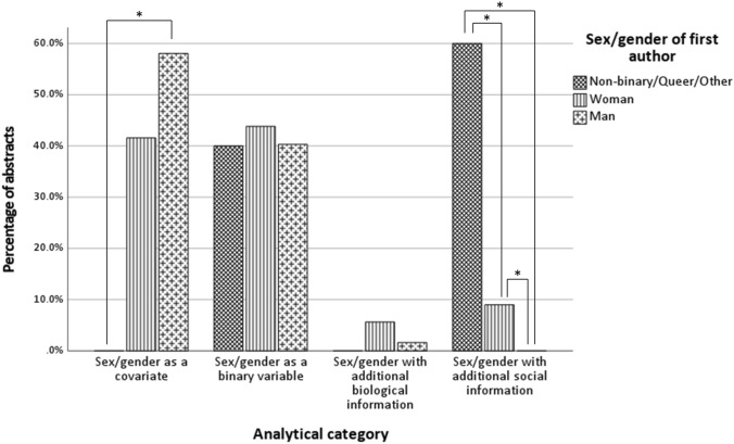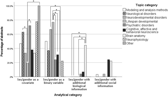 Gender inequality and diversity in STEM is a challenging field of research. Although the relation between the sex/gender of the researcher and the scientific research practices has been previously examined, less interest has been demonstrated towards the relation between sex/gender of the researcher and the way sex/gender as a variable is explored. Here, we examine, from a neurofeminist perspective, both questions: whether sex/gender identity is related to the examination of sex/gender as a variable and whether different approaches towards examining sex/gender are being used in different topics of study within neuroscience. Using the database of submitted posters to the Organization of Human Brain Mapping 2022 annual conference, we identified abstracts examining a sex/gender-related research question. Among these target abstracts, we identified four analytical categories, varying in their degree of content-related complexity: (1) sex/gender as a covariate, (2) sex/gender as a binary variable for the study of sex/gender differences, (3) sex/gender with additional biological information, and (4) sex/gender with additional social information. Statistical comparisons between sex/gender of researcher and the target abstract showed that the proportion of abstracts from Non-binary or Other first authors compared to both Women and Men was lower for all submitted abstracts than for the target abstracts; that more researchers with sex/gender-identity other than man implemented analytical category of sex/gender with additional social information; and, for instance, that research involving cognitive, affective, and behavioural neuroscience more frequently fit into the sex/gender with additional social information-category. Word cloud analysis confirmed the validity of the four exploratorily identified analytical categories. We conclude by discussing how raising awareness about contemporary neurofeminist approaches, including perspectives from the global south, is critical to neuroscientific and societal progress.