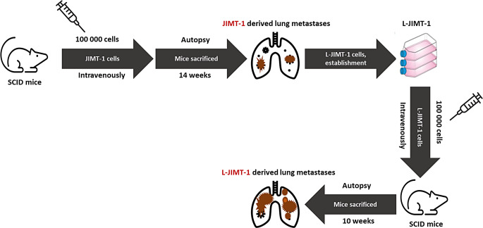 Human epidermal growth factor 2 (HER2)-positive breast cancer with lung metastases resistant to targeted agents is a common therapeutic challenge. Absence of preclinical lung metastasis models that are resistant to multiple anti-HER2 targeted drugs hampers the development of novel therapies. We established a novel HER2-positive breast cancer cell line (L-JIMT-1) with a high propensity to form lung metastases from the parenteral JIMT-1 cell line by injecting JIMT-1 cells into immunodeficient SCID mice. Lung metastases developed in all mice injected with L-JIMT-1 cells, and more rapidly and in greater numbers compared with the parental JIMT-1 cells. L-JIMT-1 cells expressed more epidermal growth factor receptor and HER2 than JIMT-1 cells. L-JIMT-1 cells were resistant to all five tyrosine kinase inhibitors tested in vitro (afatinib, erlotinib, lapatinib, sapitinib, and tucatinib). When we compared JIMT-1 and L-JIMT-1 sensitivity to three HER2-targeting antibody-drug conjugates (ADCs) trastuzumab emtansine (T-DM1), trastuzumab deruxtecan (T-DXd), and disitamab vedotin (DV) in vitro, JIMT-1 cells were resistant T-DXd, partially sensitive to T-DM1, and sensitive to DV, while L-JIMT-1 cells were resistant to both T-DM1 and T-DXd, but moderately sensitive to DV. In a mouse model, all three ADCs inhibited the growth of L-JIMT-1 lung metastases compared to a vehicle, but DV and T-DXd more strongly than T-DM1, and DV treatment led to the smallest tumor burden. The L-JIMT breast cancer lung metastasis model developed may be useful in the evaluation of anti-cancer agents for multiresistant HER2-positive advanced breast cancer.