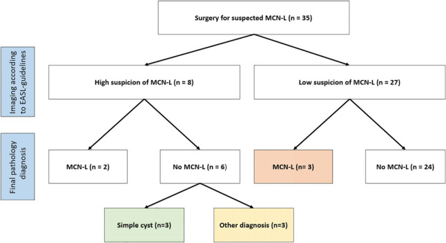 Conclusion: Although the new EASL-guidelines provide some guidance, they could not reliably distinguish MCN-L from other cysts in our series. Thus, preoperative diagnosis of MCN-L remains challenging and we should be careful in selecting surgical strategies based on these criteria.